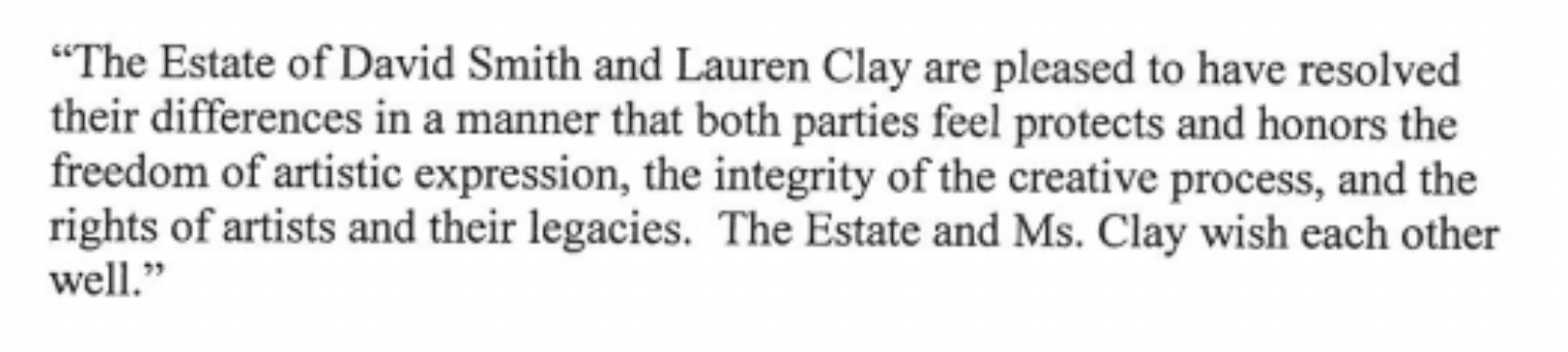 Last month, attorneys negotiating on behalf of Lauren Clay, and the Estate of David Smith (Richard A. Altman and Donn Zaretsky respectively) reached an agreement. In the jointly issued statement, approved by both sides, the parties admitted that they have resolved their differences, stemming from a copyright (infringement versus fair use) dispute, “in a manner that both parties feel protects and honors the freedom of artistic expression…” However, some have interpreted the agreement as limiting Lauren Clay’s artistic freedom.