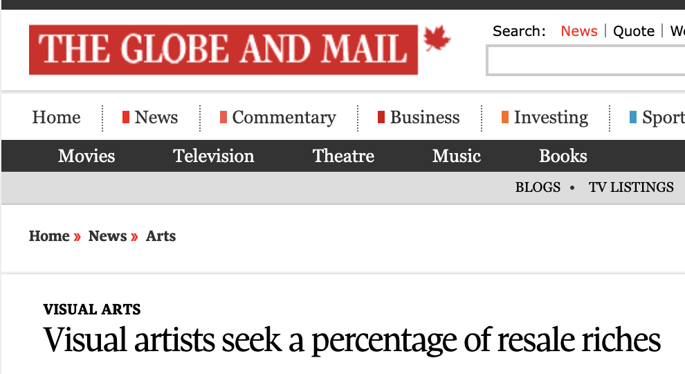 “The whole value of an art work is not made on the original sale,” said April Britski, national executive director of the Canadian Arts Representation [CARFAC]. “Visual artists are at a great disadvantage compared to writers or musicians who keep getting money from recordings or books. [With art,] you sell it once and it’s gone.”