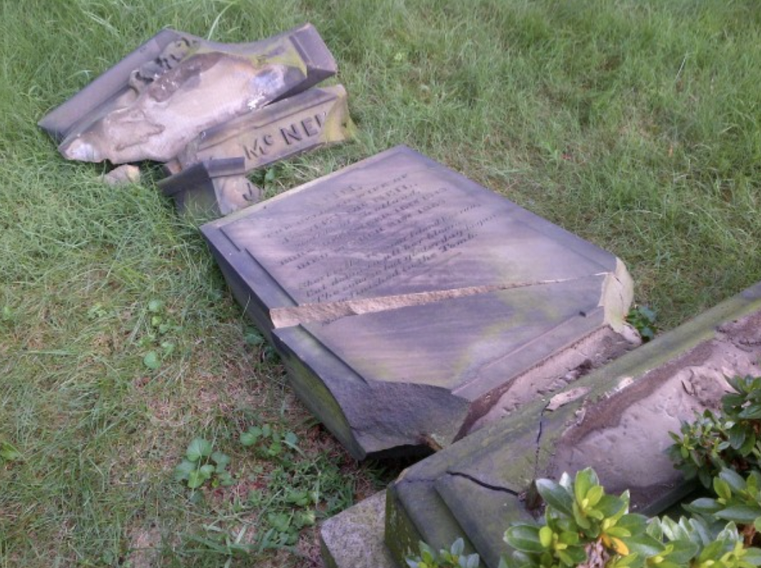 Dozens of tombstones and memorials have been vandalized at the Brooklyn’s historic cemetery the week of August 19, 2012, resulting in approximately $100,000 damages. According to the groundskeepers of the 19th-century Green-Wood Cemetery, more than 50 gravestones, plaques and statutes have been knocked down. Since its opening in 1838 it has never suffered destruction of similar magnitude. In 2006, the Green-Wood Cemetery was designated a National Historic Landmark. Many of the toppled stones date back to the 1800s. Mutilation of the statutes took place despite the fact that the grounds are protected by high cast-iron fence, video surveillance, and 24-hour car patrol of the grounds.