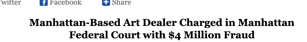 On January 22, 2012, Robert Scott Cook, a Madison Avenue art dealer, was charged for allegedly defrauding a client of 16 artworks by Picasso, Manet, Matisse, Renoir and others worth more than $4.2 million. Cook, a principle of Cook Fine Art (2005-2011), sold watercolors, drawings and photographs to galleries and auction houses behind the owner’s back for years. Sales took place over a course of six years and they were done without owner’s consent or to his benefit as proceeds were never shared. According to the F.B.I.’s assistant director in charge in New York, Janice K. Fedarcyk, “Mr. Cook is a crook.” If convicted he faces a maximum of 20 years in jail and a $250,000 fine.
