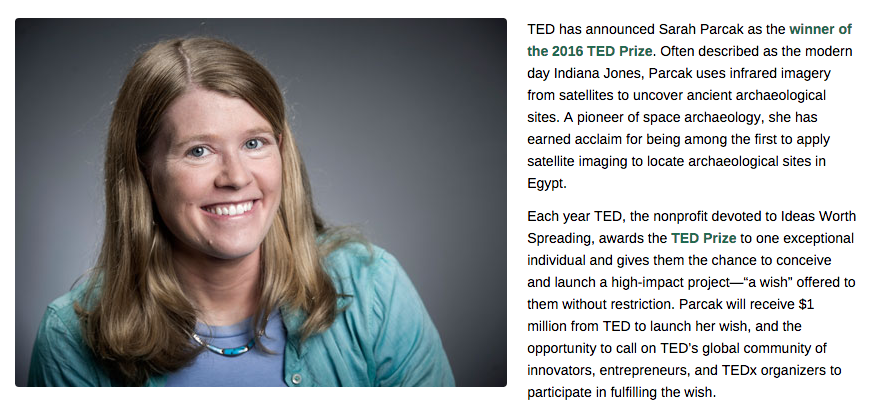 Last month, the TED prize, a nonprofit forum for cutting edge ideas, was awarded to Dr. Sarah Parcak granting her $1 million to develop a project connected to her work in satellite archeology. Dr. Parcak is the founding director of the University of Alabama at Birmingham’s Laboratory for Global Observation, and through the use of satellite technology, has been able to track the increasingly destructive looting of archeology sites around the world. A pioneer in this new world of “satellite archeology,” Parcak has stated that she plans to use the money to continue her work in tracking, and hopefully preventing the widespread looting of cultural sites.