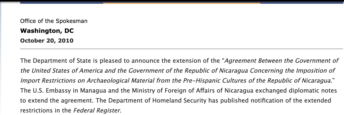 “Effective October 20, 2010, this extension signifies a continuation of cooperation that began in 2000 following Nicaragua’s request for assistance from the United States pursuant to Article 9 of the 1970 UNESCO Convention on the Means of Prohibiting and Preventing the Illicit Import, Export and Transfer of Ownership of Cultural Property. The United States demonstrates its continued respect for the cultural heritage of Nicaragua and its concern for the irretrievable loss of information about human history. Recognizing that this heritage is in jeopardy from pillage, the agreement enables the imposition of import restrictions on certain categories of archaeological material ranging in date from approximately 8000 B.C. to approximately A.D. 1500, including objects made of ceramic, stone, gold, and shell. The agreement also calls upon both governments to encourage academic institutions, nongovernmental organizations, and other organizations to cooperate in the exchange of knowledge and information about the cultural patrimony of Nicaragua, and to collaborate in its preservation and protection.”